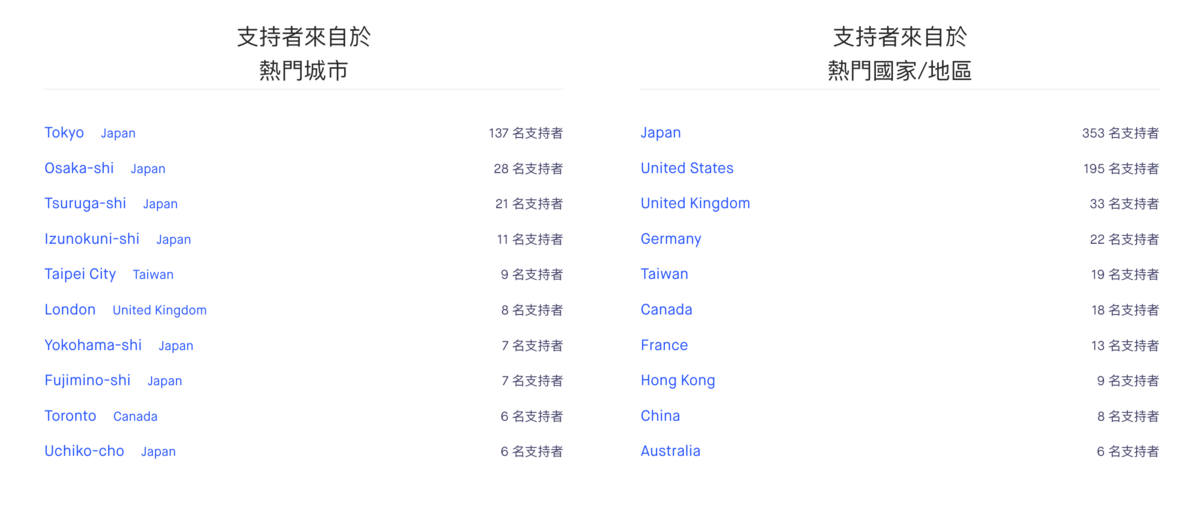 在網站的「社群」頁面,可以看到支持者來自哪個國家的排行榜。官方會去收集集資參加者來自哪個國家的資料。如果可以,請在參加集資前設定個人資料中的地點,這個資料也會反映在排行榜上。
