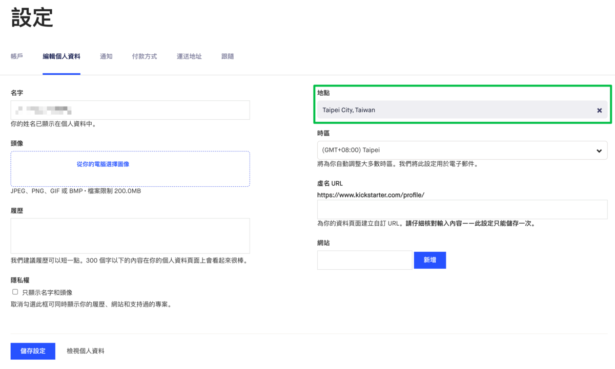 如果已經登入Kickstarter,可以直接點選這個連結→編輯個人資料→從「地點」欄位輸入英文並搜尋地點設定。