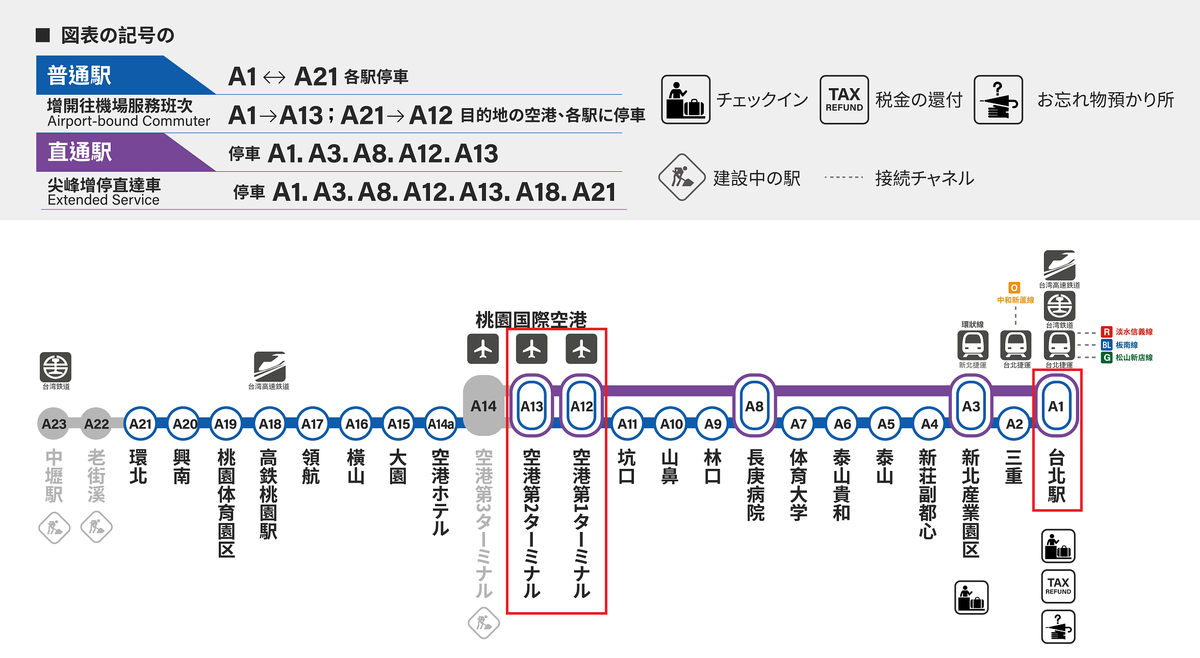アクセス:「機場第一・第二航廈(空港第1・第2ターミナル)」→「台北車站(台北駅)」(快速列車で約36分)
